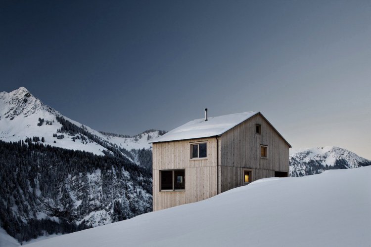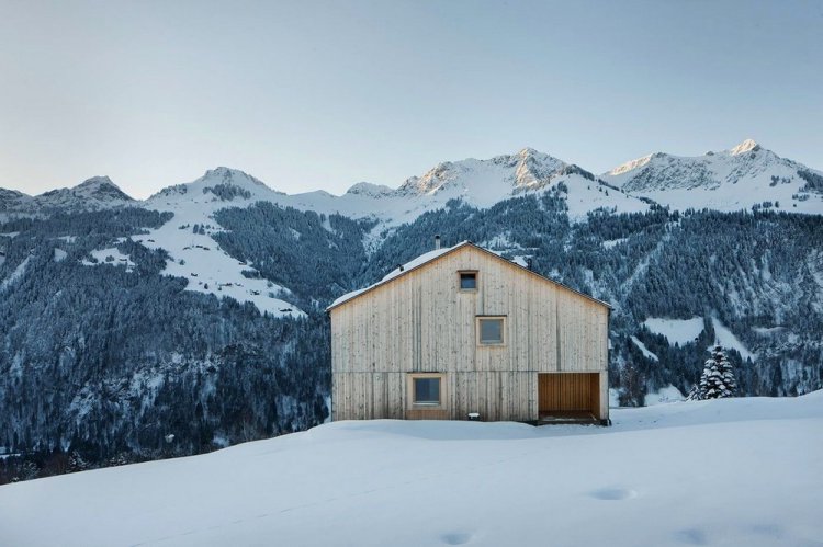 Этот дом в Австрии от архитекторов Bernardo Bader Architects расположен на наклонном участке, позволяющем наслаждаться великолепным пейзажем окрестностей. Весь фасад здания площадью 177 квадратных метров выполнен из еловой доски разного размера. Преднамеренно грубый внешний облик с хаотичными маленькими и большими окнами контрастирует с интимной атмосферой интерьера. Фундамент выполнен из бетона, остальная часть дома построена из дерева. В отделке первого этажа также используется серебристая ель, и только на верхнем уровне присутствуют элементы из гипсокартона.