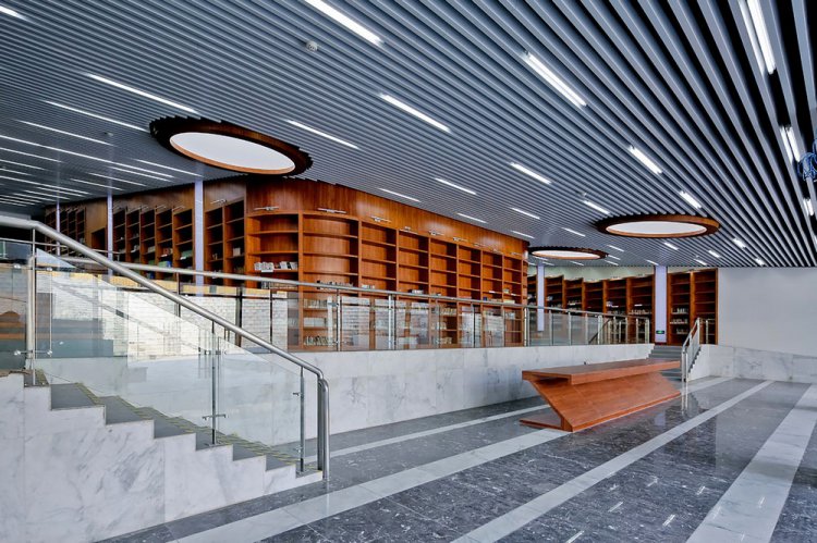 Круглая площадь, соединяющая библиотеку с центральным двором, похожа скорее на греческий амфитеатр, чем на обычное для учебных заведений публичное пространство. Её задача — создать наиболее комфортную среду для общения и взаимодействия между студентами.