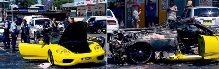 Лучше бы Шукла Тан (Tan Shukla) в этот день остался дома, но ему понадобилось снять деньги с карточки и он отправился к банкомату в Лалор Парк в пригороде Сиднея. Подъехав к банкомату на своем желтом Ferrari, он начал снимать деньги, как вдруг автомобиль, стоимостью $180 000, самопроизвольно загорелся. Хозяин бросил все, и начал спасать любимое авто, за это время "сочувствующие" граждане украли деньги с карточкой и ноутбук из горящей машины.