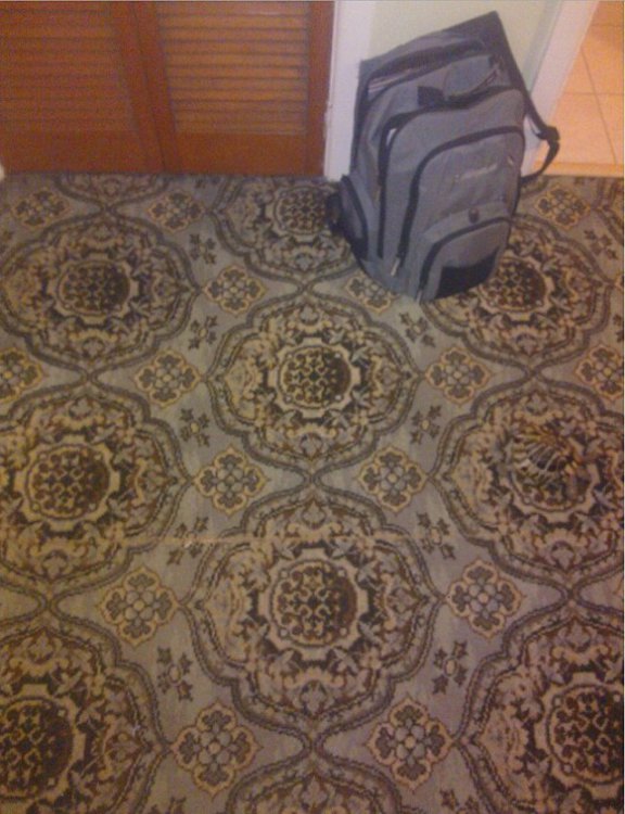 Черепаха нашла себе укромное местечко на ковре своего хозяина. Однако, если кто-то будет мимо проходить, то вполне может наступить на животное, так как панцирь черепахи сливается с узором ковра и даже имеет похожий оттенок.