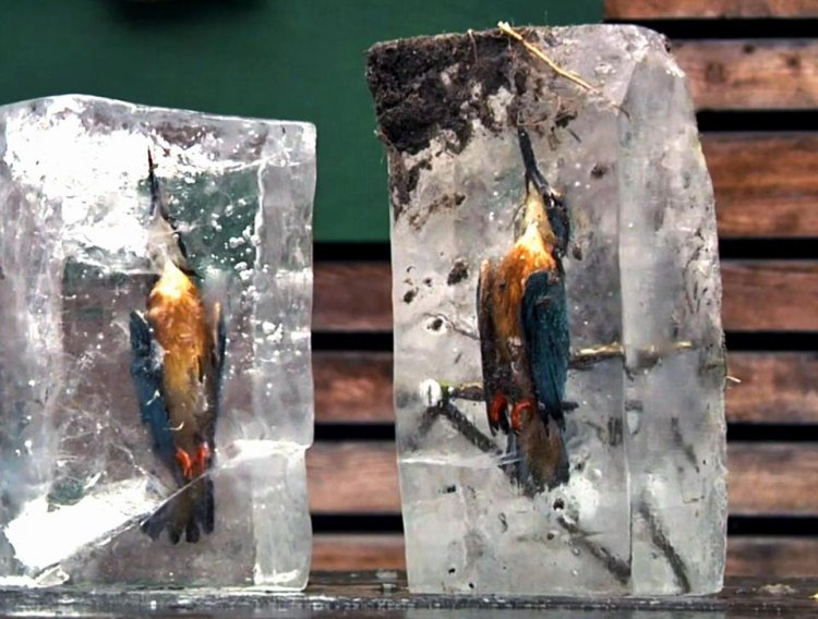 В этом году многих животных находили во льду: в Германии лиса вмерзла в лед, в США нашли вмерзших щуку с окунем во рту, такая же участь постигла двух зимородков. Птицы были найдены в районе Вайзендорф, в Северной Баварии. По всей видимости, они нырнули в незамершие отверстия за рыбой, затем просто не смогли найти выход из подледной ловушки.